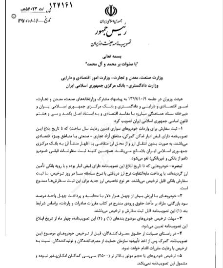 مصوبه هییت وزیران در خصوص لغو ممنوعیت واردات خودروهای باقیمانده در گمرکات